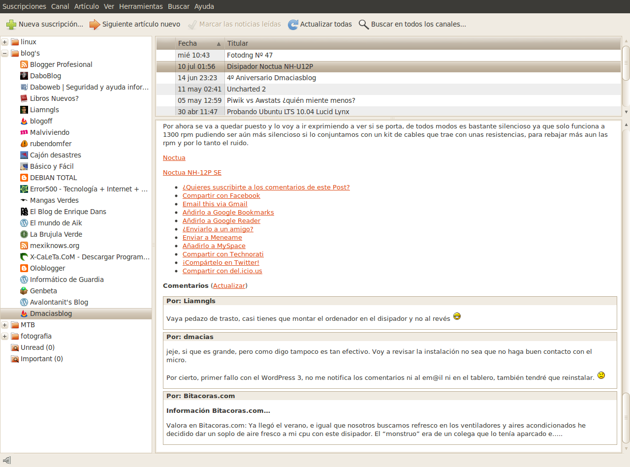 Icono aKregatorMe ha costado mucho desprenderme de mi ya antiguo lector de feed aKregator, con el que estaba muy contento porque me gustaba mucho su simplicidad e interfaz, todo organizado de forma muy lógica, ya me había adaptado a él. Pero tras varios problemas con aKregator, andando sobre Gnome han terminado porque me busque la vida por otro lado y lo más parecido que he encontrado ha sido Liferea (Linux Feed Reader).